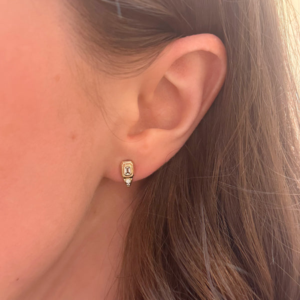These diamond stunners are DRIPPY. I love the mix of pave diamonds and that gorgeous emerald cut stone. J hoops are a great everyday earring because they have the sparkle of huggies with the comfort of studs!