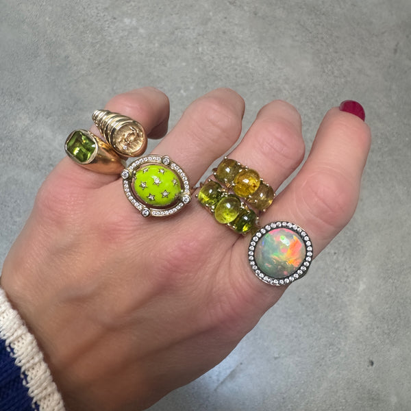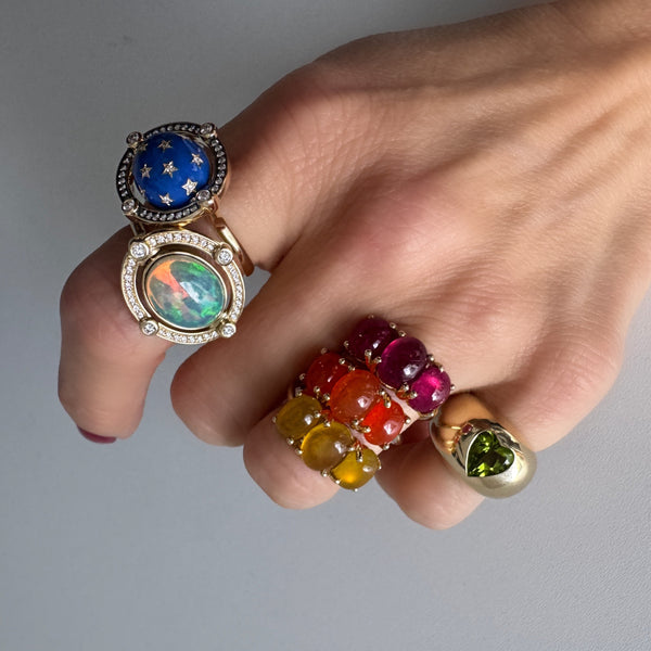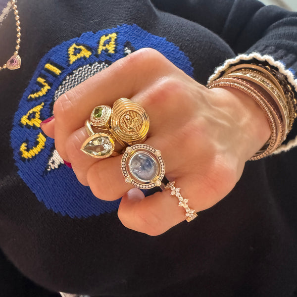 You know I obsess over two-for-one goodies and double-sided treasures.  This ring is a perfect statement and conversation starter. Available in moonstone and opal, you will be illuminating and lustrous!
